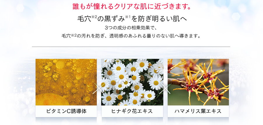 「ビタミンC誘導体」「ヒナギク花エキス」「ハマメリス葉エキス」で黒ずみを防いで、